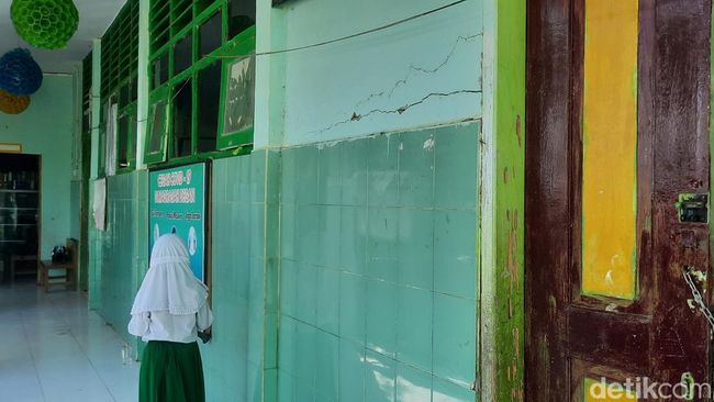 Pantauan detikcom, di MI Ainun Sahab, Kelurahan Rangas, Kecamatan Simboro, Selasa (27/9), sejumlah sisi bangunan mengalami keretakan akibat gempa yang berpusat di Mateng pada Senin (26/9) sekitar pukul 03.43 Wita.