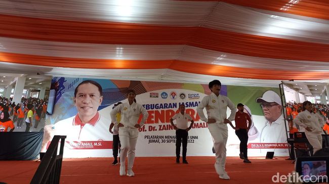 Kehadiran Menpora Zainudin Amali mengikuti kegiatan bertajuk SKJ bersama Menpora RI yang digelar di pelataran Gedung Phinisi Universitas Negeri Makassar (UNM), Jumat (30/9). Sekitar 1.000 peserta dari kalangan pelajar, mahasiswa, hingga karyawan terlibat melakukan senam.