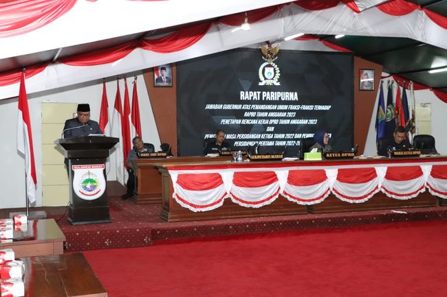 DPRD Provinsi Sulawesi Barat menggelar Rapat Paripurna jawaban Gubernur Sulbar Akmal Malik terhadap hasil pandangan umum fraksi-fraksi terkait RAPBD Tahun Anggaran 2023. Jawaban dari Akmal Malik disampaikan oleh Sekprov Sulbar Muhammad Idris.