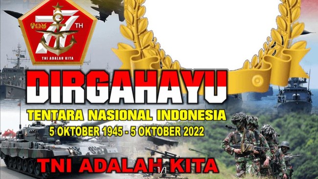 Twibbon HUT TNI 2022 hadir dengan berbagai desain yang menggambarkan semangat prajurit. Tahun ini Tentara Nasional Indonesia (TNI) menginjak usia ke-77.