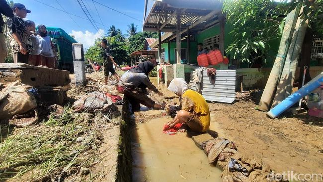 Pantauan detikcom di permukiman warga di Lingkungan Sampoang, Kecamatan Kalukku, Kamis (13/10/2022) tampak sejumlah warga disibuki aktivitas bersih-bersih pascabanjir. Lumpur bawaan banjir tidak hanya memenuhi ruas jalan, namun masuk hingga ke kediaman warga.