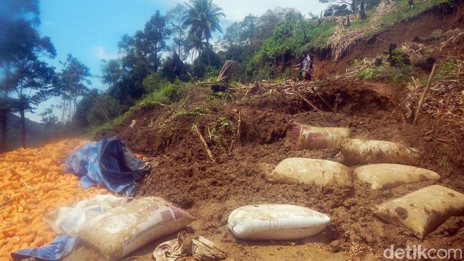 Untuk mengurangi kerugian, Baco dibantu warga berupaya menggali material longsor yang menimbun puluhan karung jagung miliknya untuk diselamatkan. Karena hanya menggunakan alat seadanya proses penggalian berlangsung lama.
