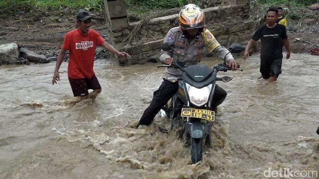 Bhabinkamtibmas yang membantu distribusi harus mengendarai motornya menembus derasnya arus sungai. Akses jembatan penghubung ke dua dusun putus usai diterjang banjir.