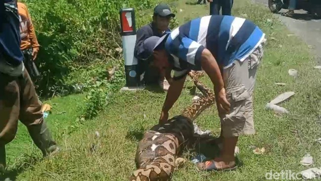 Saat ditemukan, ular piton tersebut tampak sudah sulit bergerak karena kondisi perutnya yang membesar. Namun saat berusaha ditangkap, piton tersebut memberikan perlawanan dengan melilit tangan warga.