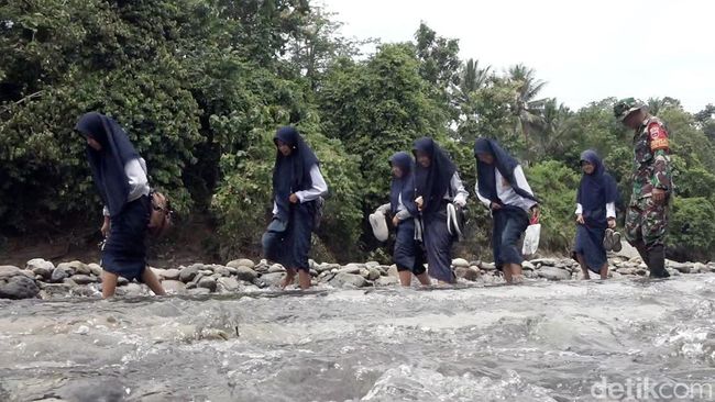 Berdasarkan pantauan detikcom, Selasa (1/11/2022), para pelajar SD maupun SMP harus membuka sepatu agar tidak basah saat melintasi sungai. Mereka tampak berjalan hati-hati saat menyeberang.