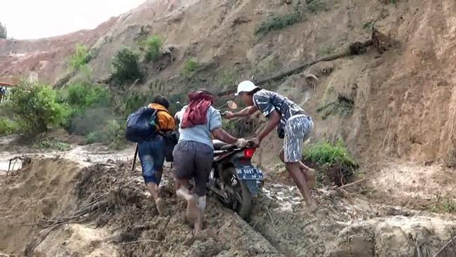 "Saya sudah dua jam terjebak di sini, karena tebing longsor, ada sekira 20 meter, ada alternatif yang dibuat, tapi untuk motor saja, itupun harus diangkat," tutur Agustinus.