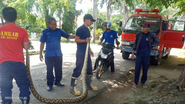 Petugas Damkar Sinjai, Sulawesi Selatan (Sulsel) mengevakuasi seekor ular sanca sepanjang 3 meter di samping rumah jabatan (Rujab) Bupati Sinjai. Petugas Damkar kini mencari warga yang berminat memelihara sanca tersebut.