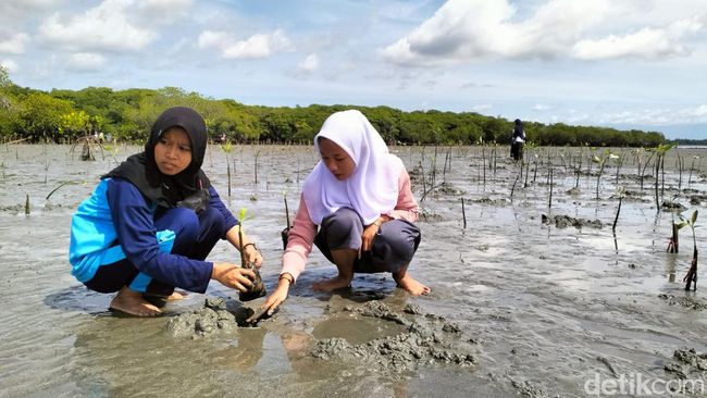 Kegiatan penanaman mangrove untuk memberikan kesadaran dan meningkatkan kepedulian masyarakat, tentang pentingnya pemulihan lingkungan, turut diikuti sejumlah guru, masyarakat dan Komunitas Rintana Jaya.