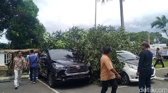 Pohon tumbang akibat angin kencang terjadi di Kantor Gubernur Maluku di Kota Ambon. Ada 2 unit mobil ringsek tertimpa pohon tumbang tersebut.