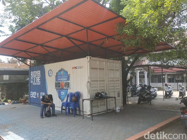 Di lokasi, tidak ada seorang petugas berjaga di kontainer Makassar Recover. Hanya terlihat seorang siswa tengah duduk di dekat kontainer.