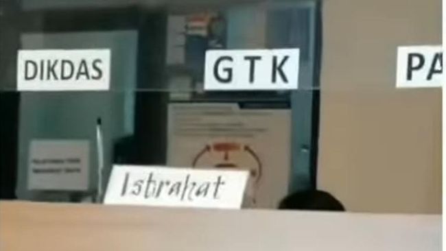Di meja pelayanan tersebut tampak sebuah papan kecil yang bertuliskan 'istirahat' yang menunjukkan petugas belum melayani. Kejadian itu dilaporkan terjadi pada Rabu (7/12/2022) lalu.