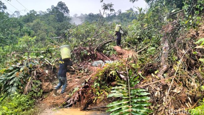 Kendaraan sudah sulit melintas di jalan tersebut. Jalur tersebut harus dilewati dengan berjalan kaki menapaki material longsor yang licin.