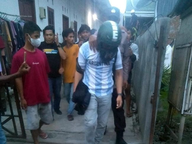 US mengenakan jersey Argentina saat diamankan polisi. Ia menutupi wajahnya dengan mengenakan helm hitam, serta menenteng jaket hitam di tangan kanannya.