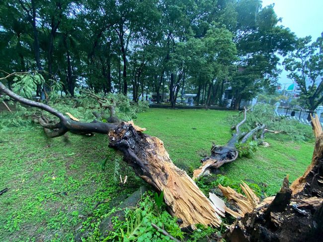 Pohon tumbang terjadi akibat hujan dan angin kencang yang berasal dari arah barat, menghantam sejumlah pohon di kantor gubernur. Dua pohon tumbang sampai tercabut akarnya.