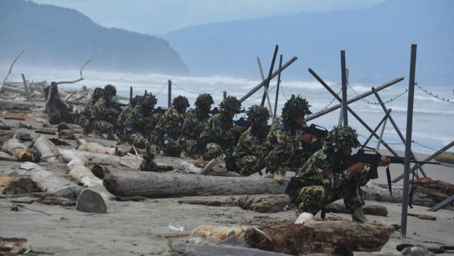 Latihan perang ini berlangsung pada Jumat (23/12). Prajurit menggelar latihan menggunakan atribut penyamaran di wilayah pesisir.