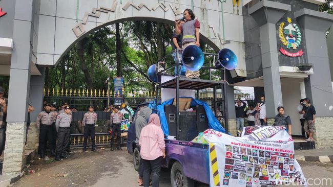 Perwakilan massa aksi terlihat berorasi menggunakan pengeras suara. Massa aksi menyampaikan tuntutan dari atas mobil komando.
