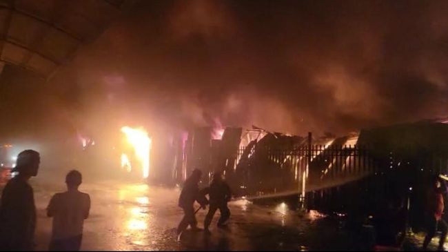 Sementara dalam video beredar, api sudah melalap sejumlah kios. Seorang petugas terlihat sedang menyemprotkan air ke titik kebakaran.
