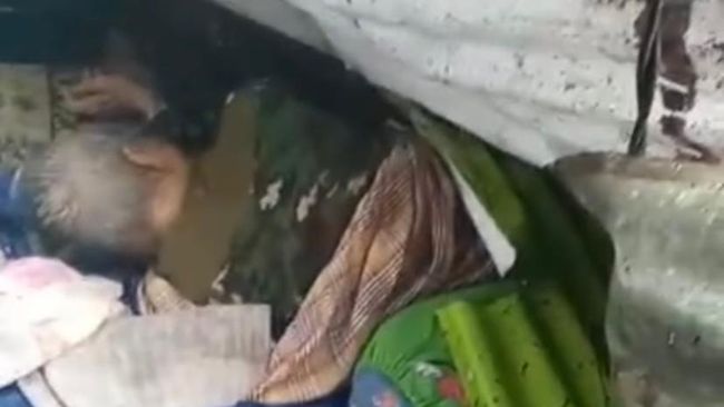 Saat itu, Dg Gewa tampak mengenakan baju kaos loreng. Ia berbaring dengan posisi menyamping di bawah reruntuhan rumahnya. Sejumlah warga tampak menyaksikan proses evakuasi tersebut.