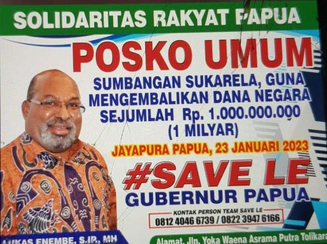 "Hari ini kami mulai membuka penggalangan dana untuk Rp 1 M. Nanti dana itu akan kami kembalikan ke KPK, untuk mengembalikan uang yang disebut KPK diterima Lukas Enembe sebagai dana gratifikasi," ungkap Koordinator Penggalangan Dana Jisman Yalengga kepada detikcom, Senin (23/1/2023).