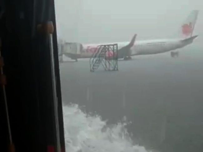 Dalam video beredar yang direkam dari atas bus ulang-alik bandara, tampak landasan pesawat bandara Sam Ratulangi tergenang air.