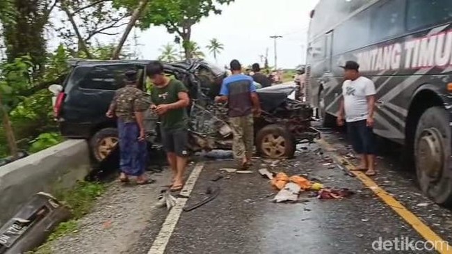 Bus Bintang Timur menabrak minibus di Kabupaten Luwu Timur, Sulawesi Selatan (Sulsel). Kondisi minibus jenis Innova yang mengangkut 5 orang penumpang itu terlihat ringkes dan tersangkut di pembatas jalan.