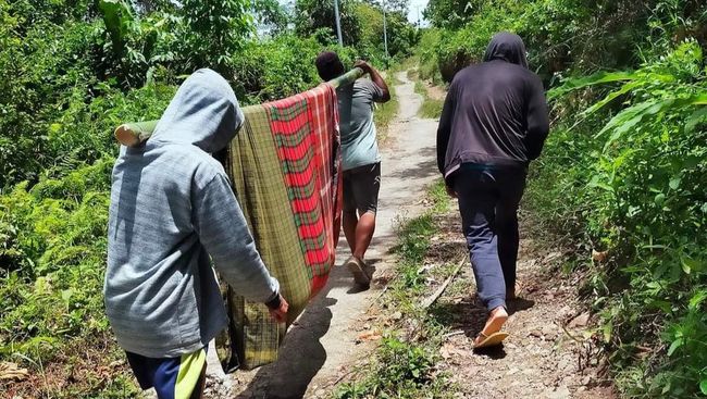 Dalam video beredar, tampak warga itu ditandu menggunakan sarung dan sebilah bambu berukuran panjang. Beberapa warga terlihat bergantian menandunya.