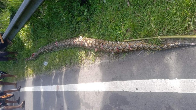 Ular itu kemudian sempat jadi tontonan para pengendara yang melintas lantaran dibiarkan usai ditebas.