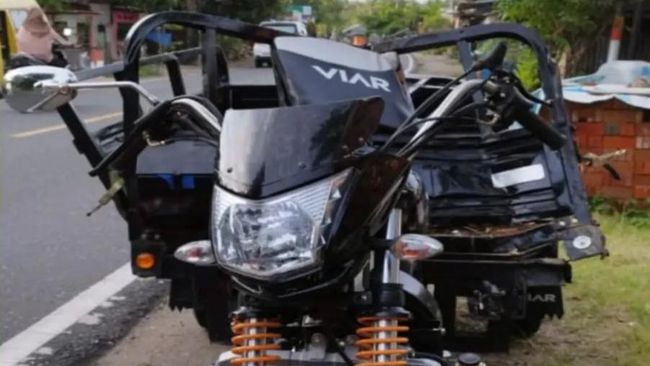 Sementara di bagian bodi kendaraan sudah terlihat penyok. Bagian bak motor roda tiga itu sudah ringsek.