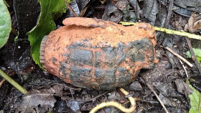 Granat tangan tersebut terlihat berwarna hitam dan bentuknya menyerupai nanas. Selain itu, granat tangan tersebut terlihat sudah berkarat hingga berwarna orange.