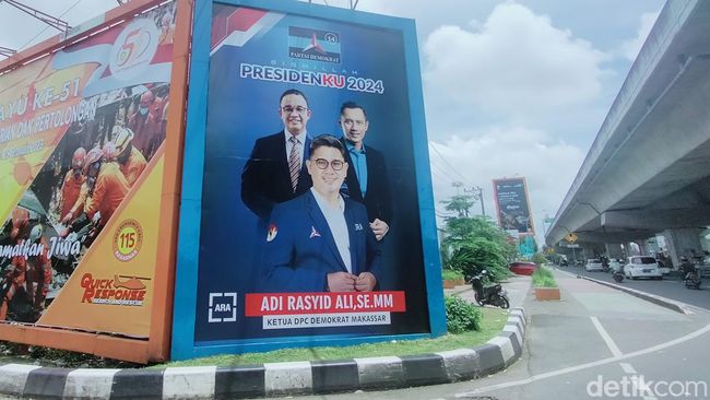 Selain itu, foto Anies-AHY terpampang besar pada bagian atas, bersama dengan foto Ketua DPC Demokrat Makassar Adi Rasyid Ali (ARA). Di titik yang berbeda, tepatnya di lingkungan kantor DPRD Kota Makassar juga tampil gambar dukungan Demokrat Makassar terhadap Anies-AHY.