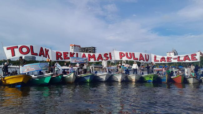 Warga Pulau Lae-lae sebelumnya melakukan unjuk rasa menolak reklamasi di Pantai Losari pada Sabtu (4/3). Warga berunjuk rasa dengan menggunakan perahu dan membentangkan spanduk bertuliskan 'Tolak Reklamasi Lae-lae'.
