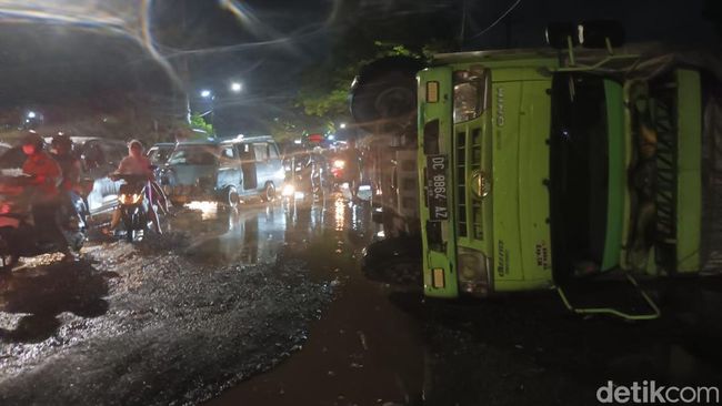 Sebuah mobil truk terbalik di Jalan Perintis Kemerdekan, Kota Makassar, Sulawesi Selatan (Sulsel). Akibatnya arus lalu lintas (lalin) macet hingga 1 kilometer.