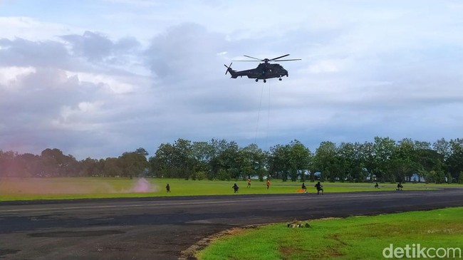 Pembukaan Latihan Sriti Gesit berlangsung di Lapangan Skadron Udara 5 Makassar, Selasa (7/3/2023). Latihan Sriti Gesit ini juga ditandai dengan terjun payung free fall dan simulasi search and rescue (SAR) tempur.