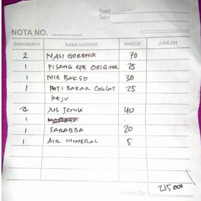 Namun alangkah terkejutnya Wiwien begitu diberitahu soal harga yang harus ia bayar. Mulai dari Rp 70 ribu untuk 2 porsi nasi goreng, harga pisang epe original Rp 25 ribu untuk satu porsi, satu mie bakso dihargai Rp 30 ribu, dan 2 jus jeruk dibanderol Rp 40 ribu. Dia juga mengeluhkan harga Rp 20 ribu untuk satu gelas sarabba, roti bakar cokelat keju senilai Rp 25 ribu satu porsi.
