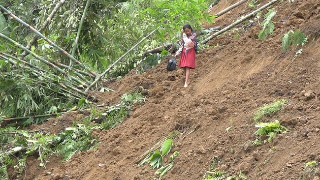 Material longsor masih menutupi Jalan Trans Sulawesi di Kabupaten Toraja Utara (Torut), Sulawesi Selatan (Sulsel) yang terhubung ke Kabupaten Mamuju, Sulawesi Barat (Sulbar). Anak sekolah terpaksa menerobos material longsoran demi sampai ke sekolah.