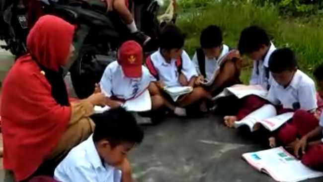 Siswa SD 203 Ukukumpang, Kabupaten Luwu Utara, Sulawesi Selatan (Sulsel) terpaksa belajar di jalan raya gara-gara gedung sekolah mereka terendam banjir. Siswa pun terpaksa belajar beralaskan terpal.