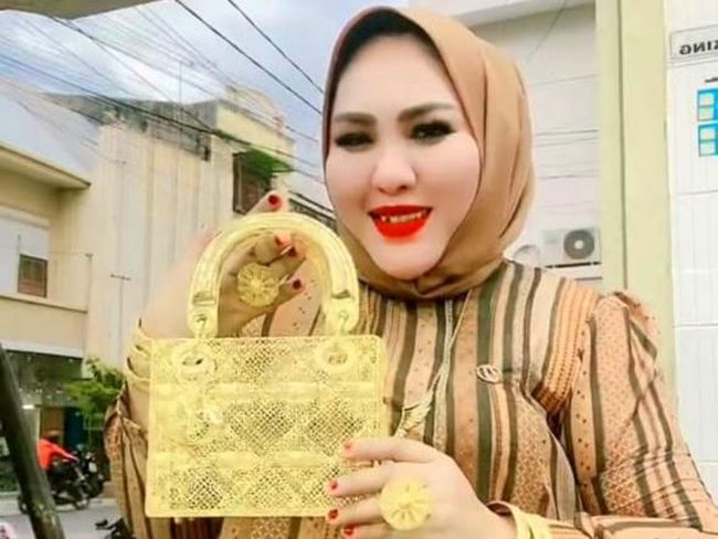 Heboh di media sosial wanita bernama Mira Hayati di Makassar, Sulawesi Selatan (Sulsel) membeli tas replika Dior yang terbuat dari bahan baku emas. Aksi wanita itu seketika menyita perhatian publik.