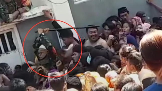 Viral di media sosial aparat diduga oknum TNI memukul mundur warga dengan benda panjang saat pembagian zakat di Masjid Raya Kota Makassar, Sulawesi Selatan (Sulsel). Warga saat itu berdesak-desakan menanti penyaluran bantuan.