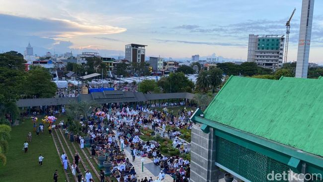 Warga di Makassar, Sulawesi Selatan (Sulsel) mulai berbondong-bondong mendatangi Masjid Al Markaz Al Islami. Jemaah yang datang langsung memasuki masjid dan bersiap melaksanakan salat Id.