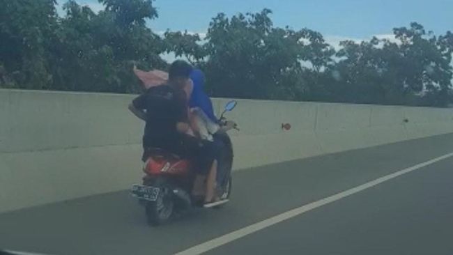 Viral di media sosial wanita pengendara motor bonceng tiga masuk ke ruas jalan tol di Makassar, Sulawesi Selatan (Sulsel). Pengendara itu juga terpantau tidak mengenakan helm.