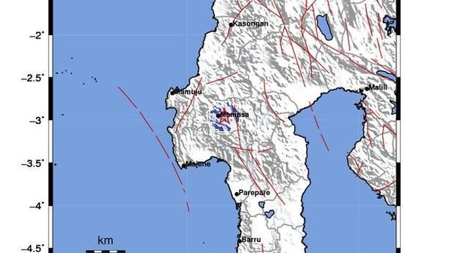 Lokasi gempa berada pada koordinat 2.93 derajat lintang selatan dan 119.40 derajat bujur timur. Gempa terjadi di darat pada kedalaman 4 kilometer.
