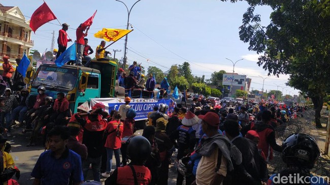 Sejumlah elemen buruh menggelar aksi demo memperingati Hari Buruh di Kota Makassar, Sulawesi Selatan (Sulsel). Massa memadati gedung DPRD Sulsel hingga memblokade jalan yang memicu kemacetan arus lalu lintas.