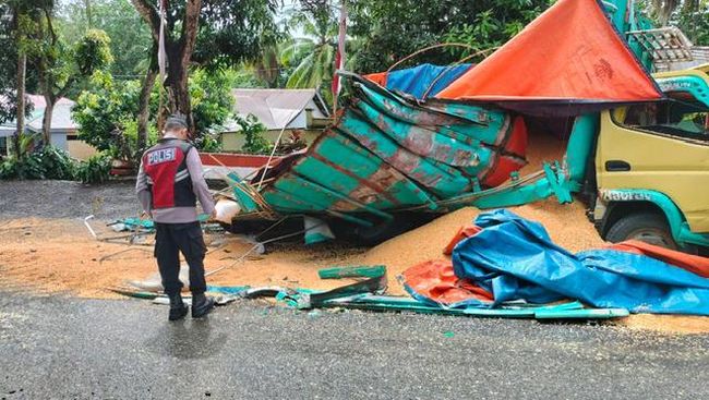 Truk bermuatan jagung di Kabupaten Bone, Sulawesi Selatan (Sulsel) ringsek usai terlibat tabrakan. Insiden ini menyebabkan 1 orang luka dan muatan yang diangkut truk itu tumpah ke jalan.