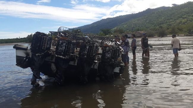 Bangkai speedboat itu berada di dekat Dermaga Kuri Pasai. Dari foto yang diterima detikcom, tampak lantai dua dan body speedboat tersebut habis terbakar dan hanya menyisakan sejumlah besi.