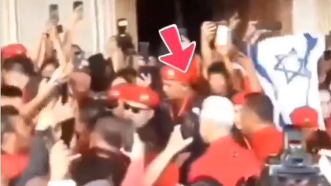 Dalam video beredar, Ganjar terlihat dikerumuni sejumlah simpatisan berjalan masuk menuju gedung tersebut. Namun di saat bersamaan seseorang berbaju merah tampak mengibarkan bendera Israel.