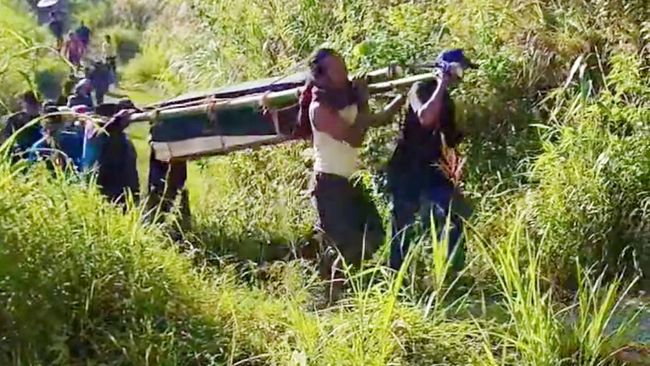 "Kemarin kami antar (tandu) mulai dari jam 12 selepas ibadah gitu, sampai mau jam 5 sore. Soalnya jalannya naik turun gunung, melewati sungai juga," jelasnya.