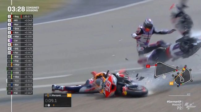 Dilansir dari detikOto, pemandangan mengerikan terjadi di latihan bebas atau free practice 2 MotoGP Jerman, Jumat (16/6) waktu setempat. Kala itu, motor Marc Marquez yang terseret di lintasan menghantam motor Johann Zarco hingga terbelah dua.