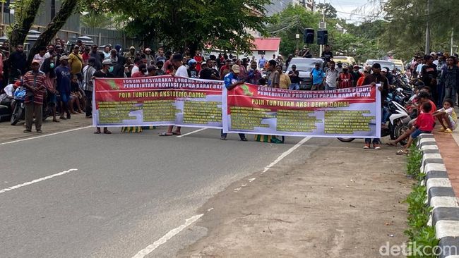 Pantauan detikcom di Jalan Kurana, Kelurahan Remu Utara, Kota Sorong, Sabtu (17/6/2023) sekitar pukul 17.00 WIT, unjuk rasa dilakukan warga yang tergabung dalam Forum Masyarakat Sorong Raya Peduli Pemerintah Provinsi Papua Barat Daya. Mereka mengeluhkan kinerja Muhammad Musa'ad yang dinilai tidak becus.