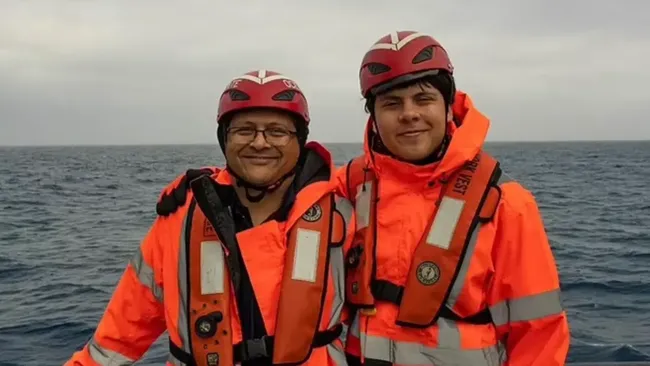 Keduanya tampak sudah siap menyelam bersama Titan sekitar dua setengah jam ke dalam laut. Mereka mengenakan jaket oranye reflektif, rompi keselamatan, sarung tangan khusus, dan helm yang serasi.