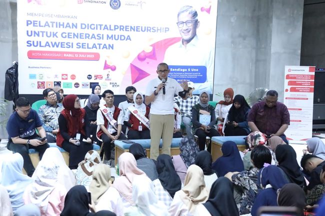 Menteri Pariwisata dan Ekonomi Kreatif (Menparekraf) Sandiaga Salahuddin Uno memberikan beasiswa wirausaha ke ratusan milenial Makassar pada Pelatihan Digitalpreneurship inisiasi Sandination. Beasiswa ini bertujuan untuk mendorong penciptaan lapangan kerja baru dari wirausaha muda berbasis digital.